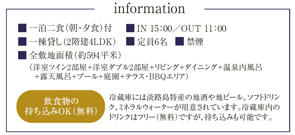館内施設として、温泉内風呂と外湯露天風呂、プールや庭園、テラス、ツイン2部屋、ダブル2部屋、リビング、ダイニング、キッチンがあり、冷蔵庫や電子レンジ、製氷機、電気ケトル、コーヒーマシーンなども完備されており、完全プライベートを満喫できる空間と各種設備が用意されています。是非この機会に、淡路島の「岩屋温泉 絵島別庭 海と森」で、自然に囲まれた新鮮な空気と移り行く四季の風景を体感しながら、万葉の昔より御食国として平安時代まで皇室・朝廷に海水産物等を献上していた淡路島産食材のおもてなし料理と温泉入浴を満喫されてみてはいかがでしょうか。