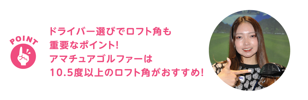 ドライバーのロフト角も重要なポイントです。最近は8度や9度という低いロフト角のドライバーを使用する方を見かけますが、アマチュアゴルファーの多くは10.5度以上のロフト角が適していると私は考えています。なぜなら、ロフト角が大きいほど球が上がりやすく、キャリーも出やすいからです。