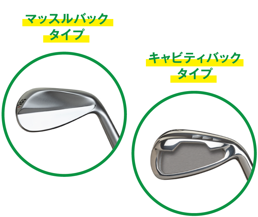 次にアイアンについてお話しましょう。アイアンは、スコアメイクの要となる重要なクラブです。「キャビティバックタイプ」と「マッスルバックタイプ」に大きく分けられ、アマチュアゴルファーの多くには、まず「キャビティバックタイプ」をお勧めします。