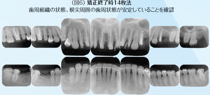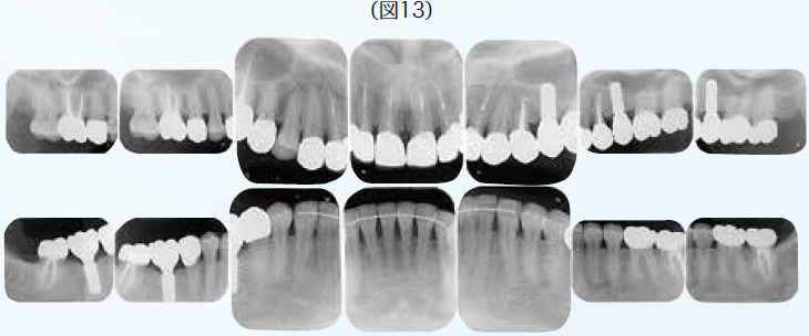初期治療において炎症のコントロールを徹底するため、歯周治療と並行して、不良補綴装置を除去してプロビジョナル・レストレーションを装着し、感染根管歯は全て再治療を行なった。初期治療終了後、矯正治療を行なった。矯正学的診断が骨格性Ⅰ級で上下顎前突傾向があり、下顎前歯部の叢生によって犬歯関係はⅢ級関係を示していた。矯正治療を行うことで歯の位置関係が改善したことを確認したのち、確定外科をインプラント治療と合わせて行い、再評価の後に補綴処置を行なった。デジタル機器を用いることで機能的にも審美的にもまた患者の要求にも対応しやすくなった。補綴処置終了後再評価を行いメンテナンスに移行した。治療期間4年で術後4年近く経過したが、無髄歯の根尖周囲組織も有髄歯の歯髄の状態も良好に経過している。欠損部にインプラントを用いたことによってブリッジの支台歯になっていた無髄歯の予知性も向上したと考える。(図2〜図14)