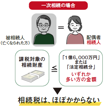 一次相続では配偶者の税額軽減があるため、配偶者の相続税はほぼかかりません。「配偶者控除(1億6,000万円または遺産の半分まで非課税)」があるため、配偶者が多く相続すると税金がほぼかからないことが多いです。極端な話、遺産が1億6千万の場合、配偶者が全て相続すれば税金はかかりません。また、遺産が10億円の場合でも、配偶者が半分の5億円を相続しても妻の相続税はかからないのです。この5億円は配偶者の法定相続分相当額だからです。