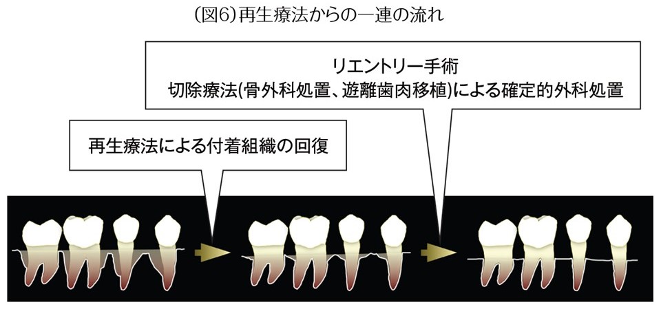 これが、リエントリー手術であり、生理的な骨形態獲得のために行う処置である。また、その際に歯肉歯槽粘膜にも問題が残存している場合は、骨のレベリングと同時に角化歯肉の移植を行い軟組織の条件も改善しておく(図6)。この一連の流れを、症例を通して解説する。