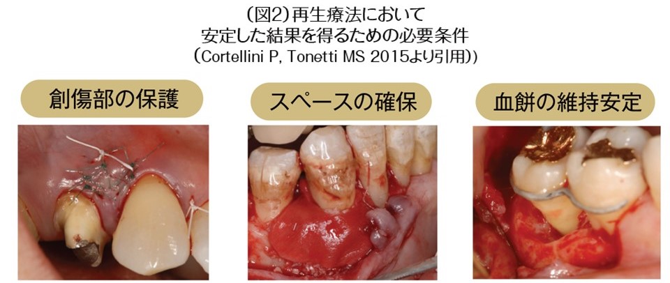 次に、再生療法を満足のいく結果に導くためには、左記の注意すべき3項目があり、「創傷部の保護」、「スペースの確保」、「血餅の維持安定」が重要であるとされている(図2)。いずれも再生療法を行う際や行なった後に注目すべきポイントであるため、しっかり把握しておく必要がある。