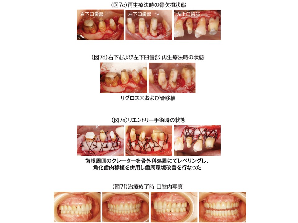 右下と左下は、残存骨壁が残存し比較的血餅の維持安定が得られやすい骨欠損であったためリグロス®と骨補填材を用いた再生療法を行った。左上は、残存骨壁も少なく浅くて広い骨欠損に加え、左上6番にはⅢ度の分岐部病変が存在したため再生療法の適応症ではないと判断したが、患者の希望もありオープンフラップにリグロス®を用い保存を試みることとした(図7c・d)。全ての部位で約1年経過後に再評価を行ったが、若干の不規則な骨形態が残存していたため、骨外科処置にて可及的に骨のレベリングを行い、さらに、付着歯肉が全く存在しなかったため、リエントリー手術時に角化歯肉の移植を行った(図7e)。