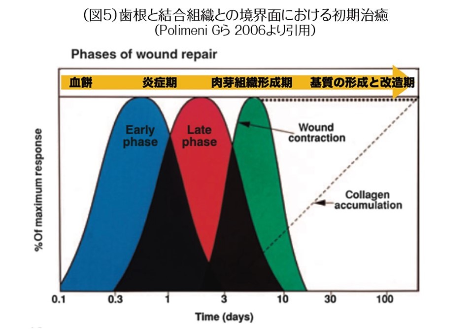 創傷初期には、フィブリンが血小板とともに重合し、血球を取り込んで血餅を形成する。その後、血餅が置換した細胞を多く含んだ結合組織が現れ、7日後には、肉芽組織形成期に移行し、象牙質表面に接着した後、基質の形成と改造期へと移行するとされている。よって、歯根面に接着した血餅は初期の創傷治癒の一部分を形作り、象牙質表面での結合組織付着は、血餅の成熟と歯根面への持続した接着によって起こるとされている。つまり、歯周組織の再生にとって、いかに未分化間葉系細胞を歯根表面に誘導し増殖分化させるか、また、それらの細胞や血液中に含まれる成長因子などをいかに再生スペースに維持安定させるかが成功の鍵を握ることとなる。