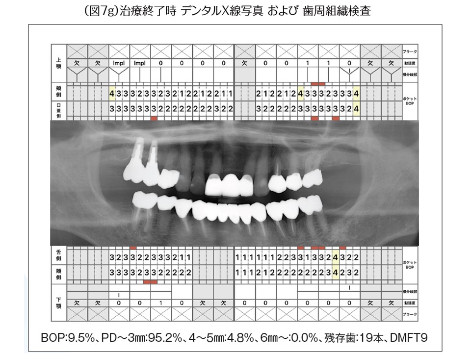 術後の歯周組織検査やパノラマ線写真からは、目標としていた浅い歯肉溝と生理的な骨レベルが獲得できているのが確認でき、再生療法と切除療法を上手く融合させたことで安定した抵抗性の高い歯周組織が獲得された(図7g)。さらに、本症例のように全顎的に歯周環境を整えておくことで、永続性のある結果へと導くことができたと考える。