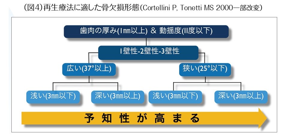 したがって、骨欠損形態によって、いかに治療戦略を練るかが再生療法の鍵を握ることになる。いずれにおいても骨欠損形態は、再生療法の予知性を測る重要な因子であるため、術前にしっかりと把握しておく必要がある(図4)。