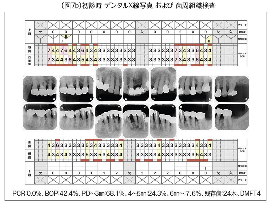 他院にて定期的にメインテナンスを受けておられたが、歯肉からの出血や歯の動揺を主訴に来院。メインテナンスを受けておられたこともあり、一見、顕著な歯肉の炎症は確認できないが、歯周組織検査やレントゲン写真からは歯周病の進行がうかがえ、歯の挺出や動揺、メタルでの固定等が観察された(図7b)。