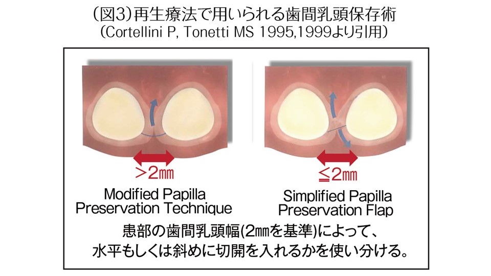 創傷部の保護とは、再生療法を行なった後、歯肉弁を戻した際に創部の裂開や壊死が起こらないように配慮することを指す。再生療法は、歯間乳頭保存術(図3)を用いて切開を行い、患部は完全に歯肉で覆った状態で手術を終える必要がある。その為には、切開部の血管再吻合を早期に回復させ、初期閉鎖を得ることが重要である。それが達成できれば、術後の裂開を防ぎ細菌による汚染を回避することができ、結果として期待した再生量を得ることが可能となる。