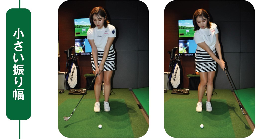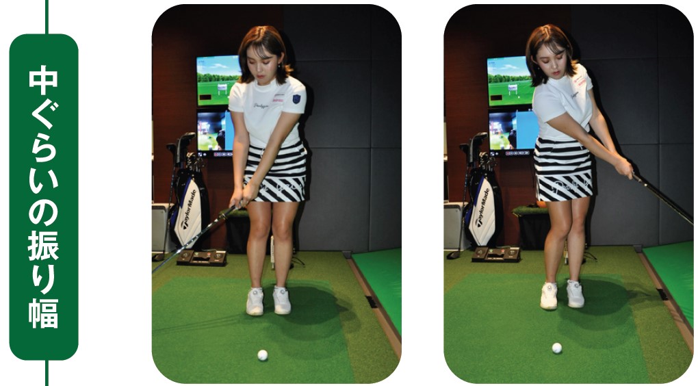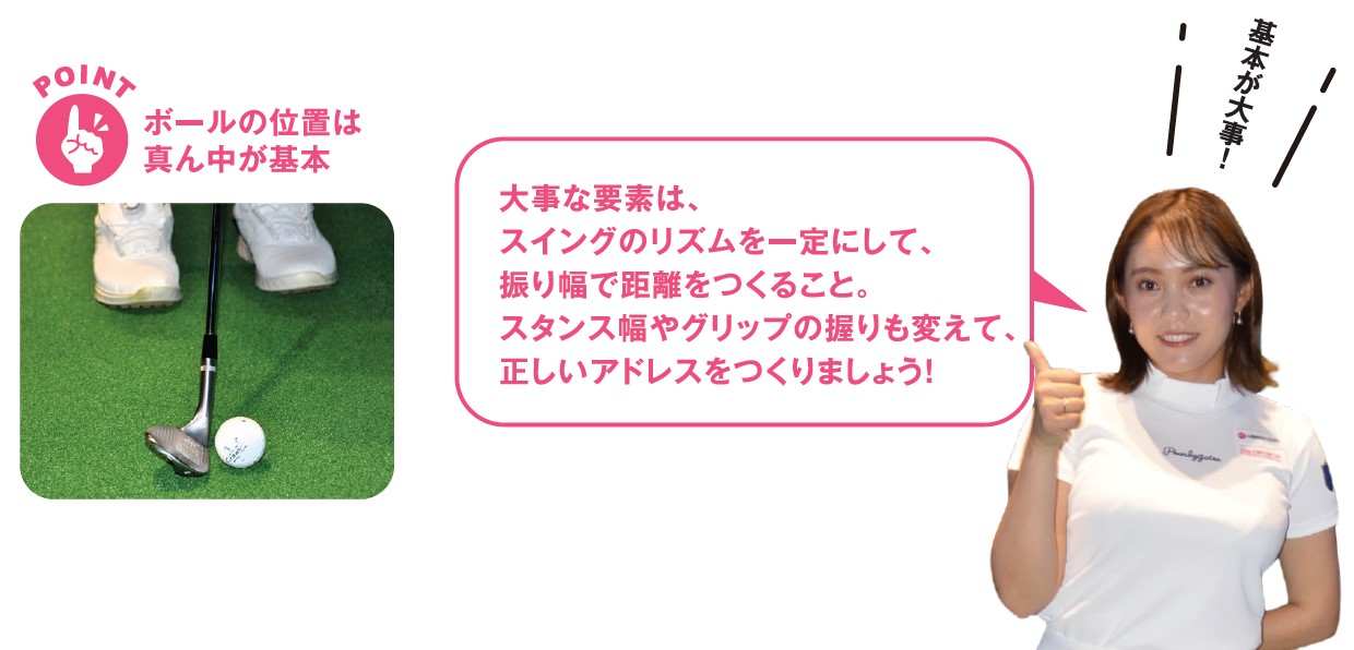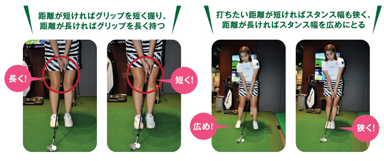 大事な要素というのは、スイングのリズムを一定にして、振り幅で距離感をつくるということです。スイングのリズムを一定にすると同時に、打ちたい距離に合わせてスタンスの幅も変えましょう。打ちたい距離が短ければスタンス幅も狭く、距離が長ければスタンス幅を広めにとります。