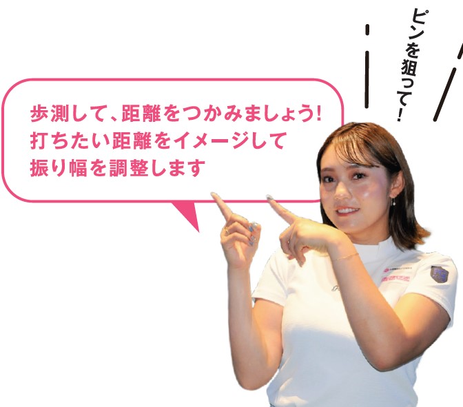 では実際にコースでは、どのように距離を把握すれば良いでしょうか。アプローチショットしたボールをどこに落とし、どのように寄せるかのイメージです。ヤードくらいの距離は、実際にグリーン上まで確認するのはスロープレーにつながりますから、とにかくピンを狙っていきましょう。