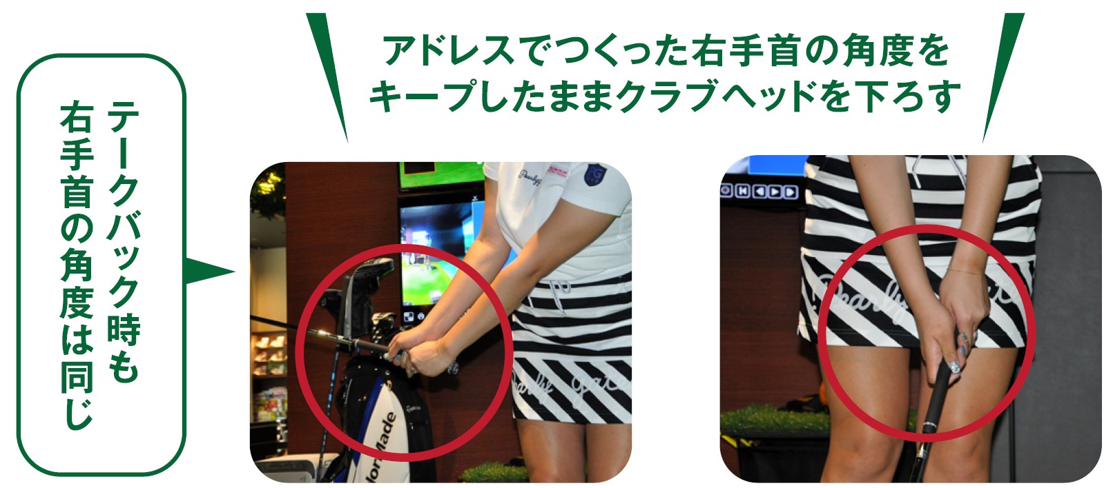 アプローチショットのアドレスの基本はハンドファースト。つまり、クラブヘッドより手が先に目標の方向にある状態です。ハンドファーストで構えておくことで、インパクトでもハンドファーストの形をキープでき、インパクト時にヘッドの入射角が安定し、ボールがフェースに乗ってスピンも入るわけです。ただインパクトでもハンドファーストの形をキープでき・・・とは言いましたが、形をキープするには右手首が重要です。アドレスでつくった右手首の角度をキープしたままの状態でクラブヘッドを下ろさなくてはいけません。
