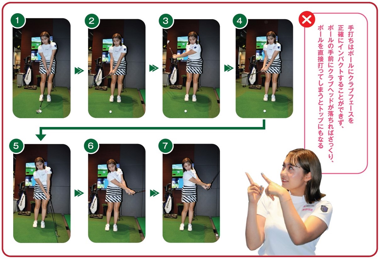 ■アプローチショットで手打ちは禁物!アマチュアの皆さんのアプローチショットを見ていると、ミスをしている方の多くが同じ動きをしているように思います。それは、距離が近いがためについ「手打ち」してしまっているミスです。飛距離を出す必要もありませんし、手打ちでもボールにクラブをヒットさせることは可能ですよね。でも、手打ちだとボールにクラブフェースを正確にインパクトすることができず、ボールの手前にクラブヘッドが落ちればざっくり、ボールを直接打ってしまうとトップにもなります。