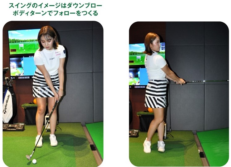 スイングのイメージはダウンブローです。ダウンブローとはクラブヘッドがスイングの最下点へ向けて下りてきている段階でインパクトを迎える軌道のことを言います。そしてクラブフェースはややオープンに構え、ボールはセンターより右側にセットします。ただしダウンブローを意識しすぎてはいけません。なぜならボールをセンターより右側にセットすることで、意識しなくてもダウンブローのアプローチショットになるからです。右手首の角度をキープしたままバックスイングに入り、そのままダウンスイングで下ろすだけです。ここでリストターンして右手首の角度を変えてしまうと、ざっくりやトップになる原因となってしまいます。リストターンをしては安定したストロークにはなりませんので、短い距離でもアドレスで形をつくった右手首の角度をキープしたまま、ボディターンでストロークしていきましょう。