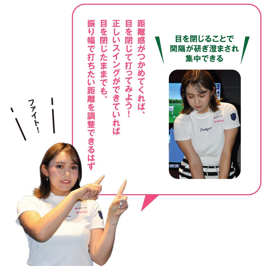実は打球練習場でも磨くことができるのです。打球練習場の大半が、フィールド上にヤード、ヤードなどの距離表示があるはずです。この距離表示を基準にして練習するだけです。単純に距離感を掴むために同じ距離を繰り返し打つだけでもいいのですが、それに慣れてくれば、目を閉じて打ってみてください。正しいスイングができていれば目を閉じたままでも、しっかりバンスを使って打つことができるでしょうし、振り幅で打ちたい距離を調整できるはずです。ボールを打った後は目を開けて、実際の弾道を確認してください。目を閉じることで感覚が研ぎ澄まされ、振り幅で距離をつくることに集中できるはずです。