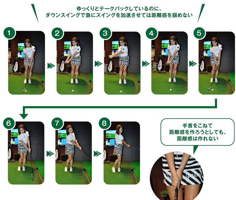 アプローチの距離感というのは誰しも持つ課題ですね。ゴルフのスコアの6割は100ヤード以内のショットと言われています。それくらい大事なシチュエーションですが、距離が合わず悩んでおられる方も多いのではないでしょうか。距離感で悩んでおられる方の大半が、距離感は感覚で出すと思っておられるようです。もちろん感覚も必要なのですが、もっと必要な要素があるのです。距離感を感覚で出そうとされている方の多くが、インパクトの強さ、加減で距離を調整しようとしています。ゆっくりとテークバックしているにも関わらず、ダウンスイングで急にスイングを加速させる。これでは一定の距離感は掴めません。同じように手首をこねて手首で距離を調整しようとする人もいますが、これも距離感はつかめません。