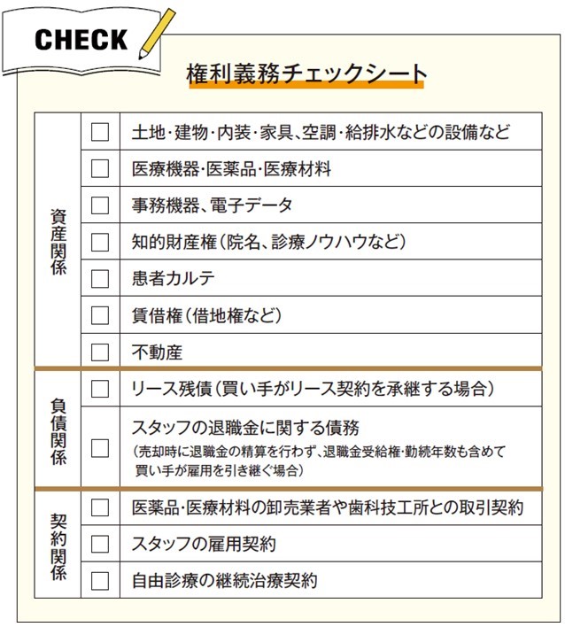 例えば、「個人立」の売買の場合は、事業譲渡となり、患者さんのレセプト、チェア・CTやレントゲンなどを含む機材など、事業を構成する権利義務すべて(有形・無形の資産、債権・債務、取引契約・雇用契約など)を買い手に譲渡するという事になります。しかし、債券・債務、契約などについては、相手方の同意を得なければ買い手に移転できません。
