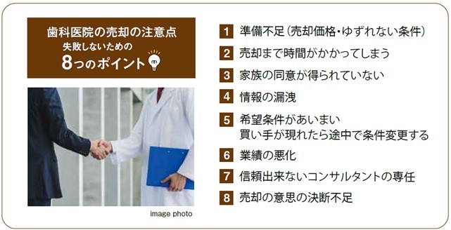 今回は今回は、歯科医院の売却の流れや手続きなど基本的な事について、大阪府内での事例をもとに解説させて頂きました。歯科医院の売却は、経営が悪化してからや体調不良により売却を検討する院長先生が多いのも事実です。しかし歯科医院の売却は、買い手が現れても売却が不調に終わってしまう原因として、8つの項目(下図)になります。