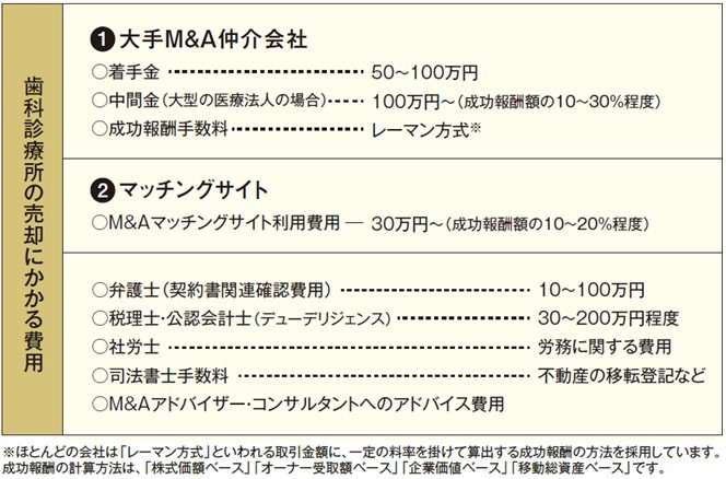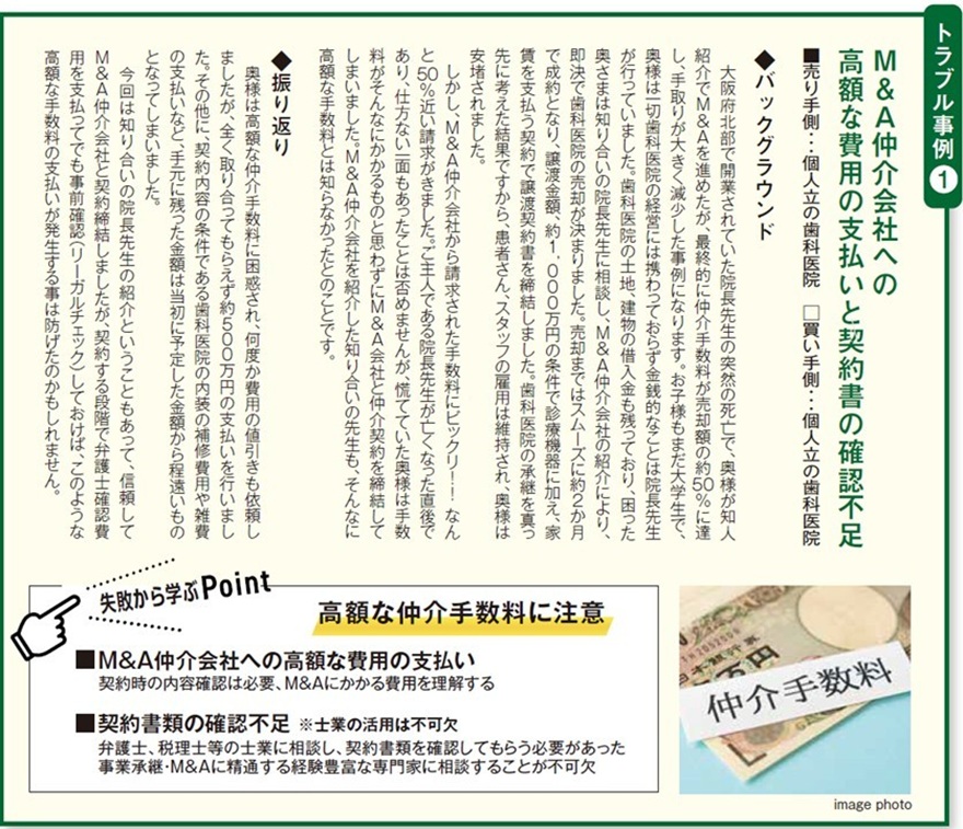 理解しないとトラブルになる・・・個人立の歯科医院の場合は、事業の譲渡になりますので、概ね売却価格の5〜%程度が、M&A仲介会社へ支払う報酬となっています。