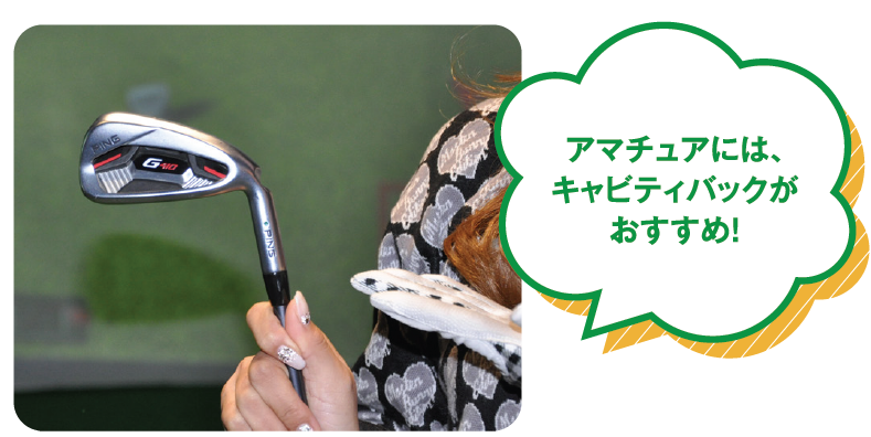 次にアイアンについてお話しましょう。アイアンは、スコアメイクの要となる重要なクラブです。「キャビティバックタイプ」と「マッスルバックタイプ」に大きく分けられ、アマチュアゴルファーの多くには、まず「キャビティバックタイプ」をお勧めします。