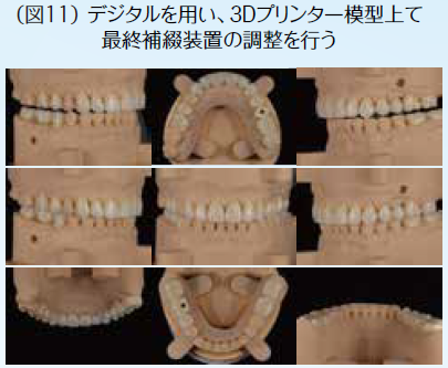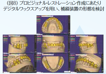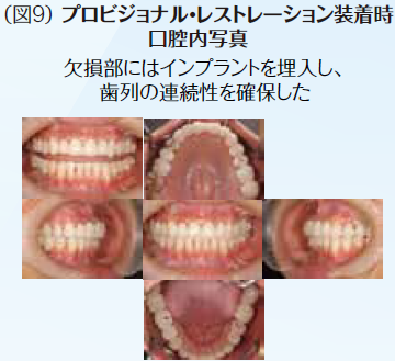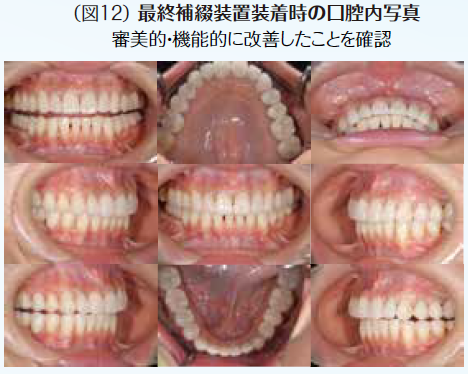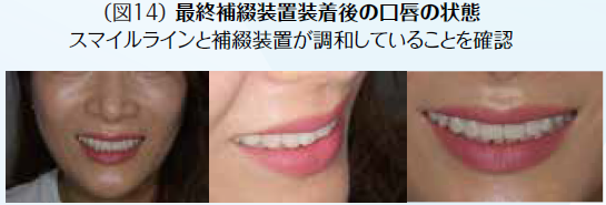 初期治療において炎症のコントロールを徹底するため、歯周治療と並行して、不良補綴装置を除去してプロビジョナル・レストレーションを装着し、感染根管歯は全て再治療を行なった。初期治療終了後、矯正治療を行なった。矯正学的診断が骨格性Ⅰ級で上下顎前突傾向があり、下顎前歯部の叢生によって犬歯関係はⅢ級関係を示していた。矯正治療を行うことで歯の位置関係が改善したことを確認したのち、確定外科をインプラント治療と合わせて行い、再評価の後に補綴処置を行なった。デジタル機器を用いることで機能的にも審美的にもまた患者の要求にも対応しやすくなった。補綴処置終了後再評価を行いメンテナンスに移行した。治療期間4年で術後4年近く経過したが、無髄歯の根尖周囲組織も有髄歯の歯髄の状態も良好に経過している。欠損部にインプラントを用いたことによってブリッジの支台歯になっていた無髄歯の予知性も向上したと考える。(図2〜図14)