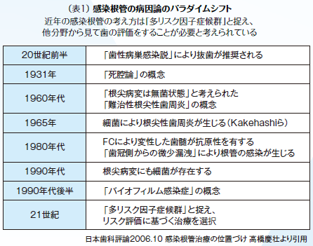 しかしながら、臨床において長期にわたり口腔内をメンテナンスしていく中で、一旦病態が改善しても再発する症例も実在する。感染根管治療の病因論のパラダイムシフトとして感染根管を『多リスク因子症候群』(表1)と捉え、リスク評価に基づく治療を選択することが必要と考える。