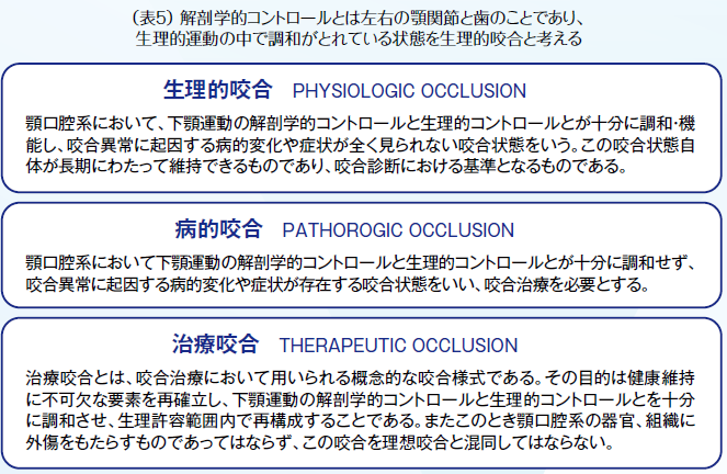 しかし歯のポジション、歯周組織の抵抗性、咬合力の強さなど生理的に恒常性を維持できない状態に陥ると、病的咬合と診断し治療咬合(表5)を付与する必要性がある。