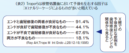 根管治療歯においての成功率を示したデータでRay AH,Trope Mらは、Int Endo J,28:12-18,1995でX線での予後良好な症例を歯冠修復とエンドの関係から見たデータを示した。その内容は(表2)に示すように、根管処置後の歯冠修復の合否が根管処置歯の予後に大きく影響することが報告されている。では、修復処置を行う上でどういった条件が必要か考えてみる。