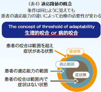 理想咬合でなくても人の体は生理的に恒常性を保とうと働き、そのバランスが保たれていれば、生理的咬合と判断し、そのバランスが崩れないようにメンテナンスすることに努める必要がある(表4)。