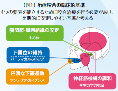 治療咬合の臨床的基準は(図1)に示すように骨格的に安定した位置に下顎骨が収まり(中心位)、その位置をずらさないようにするために臼歯郡によるバーティカル・ストップが確保され、その状態で咬頭干渉を起こさないようにするために適正なアンテリア・ガイダンスを付与することが必要で、その与えられた咬合様式が生体に無理なく自然に活動できる状態にすることが治療咬合の臨床的基準と考える。