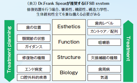Frank Spearが提唱する修復処置を成功させる条件として、審美的にも自然で機能的にも咬合性外傷を起こさない形態で、それが壊れず生体に受け入れられるような補綴置装置を装着することが必要と唱えている。言い換えれば(表3)に示すように修復処置を成功させるには、Esthetics・Function・Structure・Biologyの要素が整っていることが条件と言える。