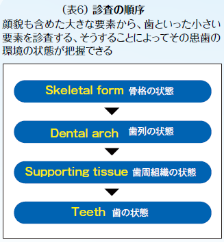 その治療咬合を与えるために咬合治療を行うにあたり、十分な診査・診断が必要である。では、その歯の診査をする前に歯列・歯周組織の状態を診査する必要があり、尚且つその前に顔貌を含めた骨格的な診査といった包括的な診査から行う必要があると考える(表6)。