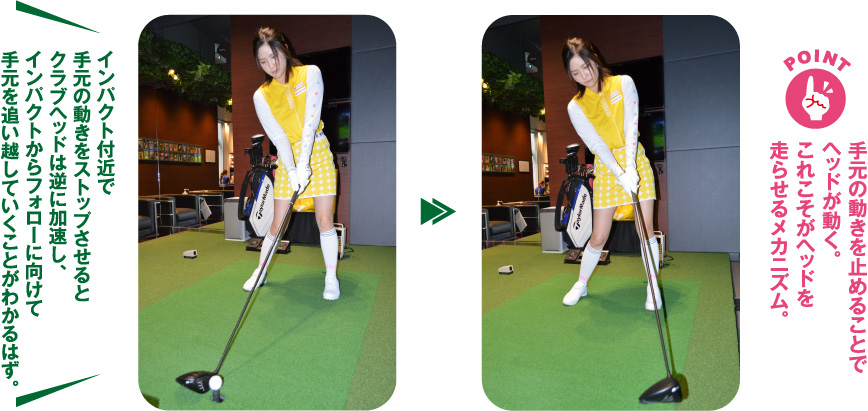 まずヘッドを走らせるという感覚を掴むには、スイングの途中で腕の動きを止めてみることでその理屈がわかると思います。普段のスイングよりもゆっくりと力を抜いて、インパクト付近で手元の動きをストップしてください。するとクラブヘッドは逆に加速し、インパクトからフォローに向けて手元を追い越していくことがわかるはずです。自分の動きを止めることでヘッドが動く。これこそがヘッドを走らせるメカニズムだといえます。