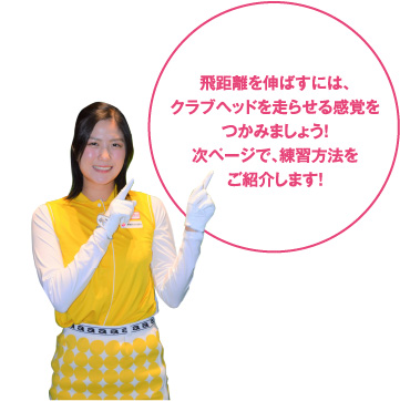 クラブヘッドを走らせるコツはスイング全体のスピードを上げるのではなく、インパクトの瞬間にエネルギーをボールにぶつけることです。そのためにはトップでできた右手首の角度をインパクト直前までキープし、〝タメ〟をつくります。そしてインパクトの瞬間にタメをリリース。これでヘッドを走らせるわけです。ヘッドスピードは男性アマチュアと同じくらいなのに、女子選手が飛距離を出せる要因は、ダウンスイングでできる、この〝タメ〟。タメを作ることによってヘッドが走り、インパクトでエネルギーをボールに伝えることができるからなのです。