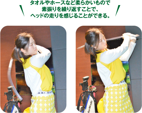 この動きを自宅で簡単にマスターできる方法があります。それが「タオルでの素振り」です。一般的なタオルの先端を結びヘッドの代役とし、その重みを感じながらインパクトの瞬間に手元の動きをストップさせるのです。そうするとタオルの先端が走り、スピードが上がっているのがわかると思います。タオル以外にもホースなど柔らかいもので代用できますので、ぜひ試してみてください。