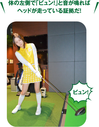 「素振りでヘッドを走らせる練習方法」です。素振りの際に、体の左側で「ビュン!」と音が鳴ればヘッドが走っている証拠。もし体の右側で音が鳴ってしまっているようであれば、ヘッドが減速しているということになります。ヘッドを走らせる練習ですから、少々無理をして左側で音を鳴らしにいっても良いと思います。この練習を繰り返すうちに、タメをつくってスイングしないと左側で音は鳴らないことが理解できると思います。修得するには時間が掛かるかもしれませんが、修得できれば一気に飛距離を伸ばすことができると思います。