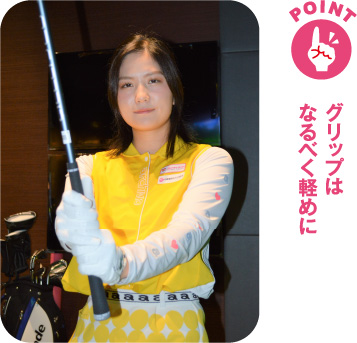 ヘッドを走らせるメカニズムが理解できれば、あとはスイングの微調整です。まずグリップを握る強さですが、できるだけ軽く握ってください。強く握ってしまうと腕にも力が入ってしまい、筋肉を速く動かすことができません。またダウンスイングからインパクトで手元が先行してしまいフェースが開きやすくなるので、右にプッシュが出たり、スライスが出てしまったりミスショットにつながります。クラブヘッドを走らせようとすると、どうしても力が入ってしまいがちですので、意識して脱力することをおすすめします。