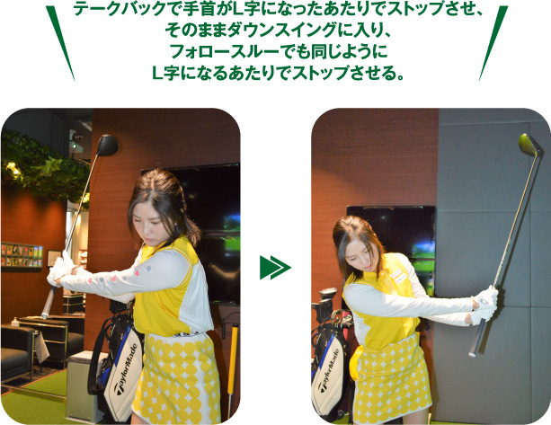 「クラブヘッドを走らせる練習方法」として、ハーフスイングを繰り返す練習がおすすめです。アドレスは実際のスイングと同じくらいの幅の肩幅ほどに開きます。クラブはやや短めにグリップを握り、テークバックで手首がちょうどL字になったあたりでストップ。そのままダウンスイングに入り、フォロースルーでも同じようにL字になるあたりでストップします。これをゆっくりと何度も繰り返します。慣れてきたら速く振っていきましょう。タメをリリースするタイミングがわかってくると思います。