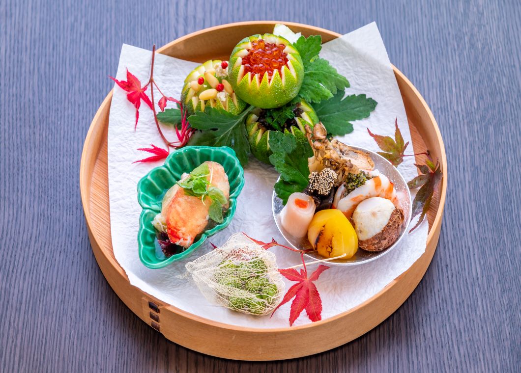 古泉閣のもう一つの魅力が、おもてなしの心あふれるお食事です。平安時代から続く「古式四條流包丁儀式」の高弟師範であり、兵庫県調理師会会長である森本料理長が手掛ける京風懐石は、風流な器の中で繰り広げられる美味の饗宴。季節を尊ぶ和の心と、繊細な技が光ります。選びぬかれた海の幸と山の幸、五感に響く口福なひとときをお愉しみください。