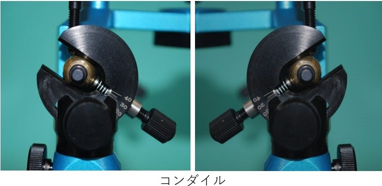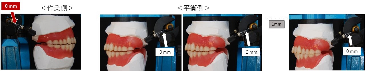 右側を作業側として、関節頭のネジを0㎜のまま、左側の関節頭のネジを1㎜ずつ出して、右側の作業側がエッジtoエネッジになるまで伸ばしていきます。そこで右側の作業側の接触する部分を青色の咬合紙で発見し、平行側の5・6・7番のどこかにバランシングコンタクトが得られるまで調整していきます。(できれば6・7番が望ましいと思います。)左側運動の咬合調整も右側の調整と全く同じ方法です。