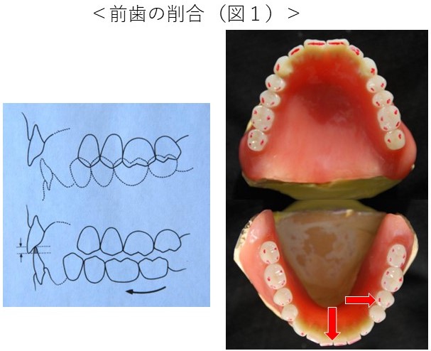 コンダイルのネジを左右同じ量、切端咬合になるまで下顎を前方に出していきます。その位置で前歯に咬合紙を入れて前歯を削合しながら臼歯が接触するまで(バランシングコンタクト調整します。5・6・7番部のどれかが接触すればOkです。できれば7番が望ましいです。前歯の削合については(図1)を参考にしてください。