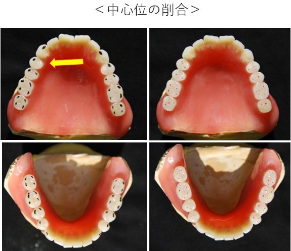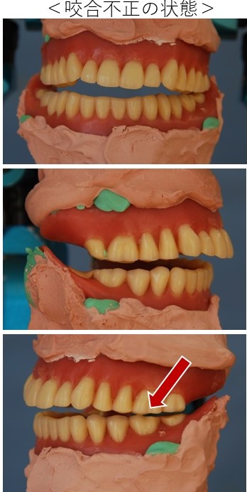 上下顎の入れ歯が咬合器に装着されたら、咬合器のインサイザルスピンを上に移動させ、バイトワックスを外して咬合させてみると、口腔内での入れ歯の咬合不正の状態がよく観察されます。