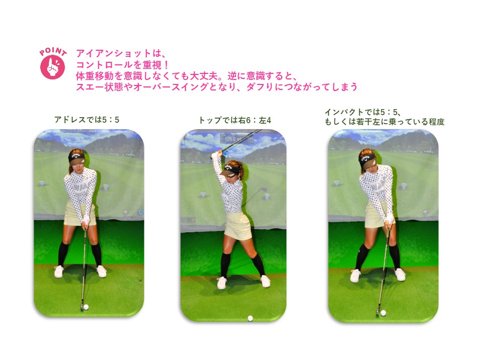 アイアンショットは飛距離よりも、コントロールを重視しますから、ドライバーほどの体重移動は必要としません。アドレスでは5対5、トップでは右6対左4、インパクトでは5対5、もしくは若干左に乗っている程度。トップでの6対4は体重移動を意識しなくても、バックスイングの勢いにより右内ももで体重を受け止める形で力を入れるだけなので、実際はほとんど体重移動していません。意識的な体重移動は必要とせず、逆に意識してしまうと、バックスイングで体、もしくは腰が右にスライドするスエーの状態となったり、必要以上に大きく振りかぶってしまうオーバースイングとなって、逆に左足体重の原因となります。スエーやオーバースイングではスイング軌道が安定せず、ダフリにつながってしまいます。
