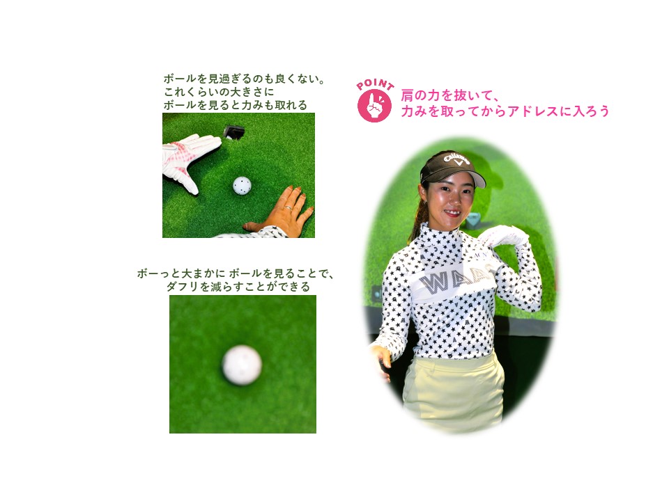 上半身の力みは、まず肩の力を抜くことで解消されます。肩を上下させれば自ずと肩の力も抜けて、上半身の力みもなくなるはずですが、それでも力が入ってしまう方もおられるでしょう。そんな方は、ボールへの意識を極力減らすという方法で力みを取り去ることが可能です。とにかくボールをはっきりと見ず、ボーっと大まかにボールを見ること。レッスンではボールをよく見て打つ・・・と教わることも多いですが、見過ぎるのも良くありません。アドレスに入る前まではボールをしっかり見て、いざアドレスに入れば、それほどボールに意識を持たず、さっと見るだけ。アドレスに入ってしまえば、あとは打つだけですから、目をつぶってショットしてもいいくらいなのです。これで体の力みが減り、ダフリも激減するはずです。