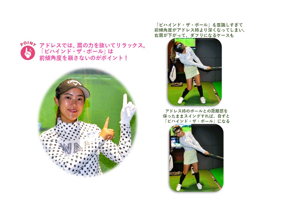 プロゴルファーのスイングを見ていると、インパクトの瞬間にボールよりも頭が後ろにある「ビハインド・ザ・ボール」になっていることが多いですね。「ビハインド・ザ・ボール」は意識してするものではなく、あくまで完成されたスイングの中で自然になるものです。アマチュアの中には「ビハインド・ザ・ボール」を意識しすぎて、これが原因でダフリにつながっているケースもあります。アドレス時の前傾の角度を変えることなく、体の回転でスイングすることで、「ビハインド・ザ・ボール」になるわけですが、意識しすぎて前傾角度がアドレス時より深くなってしまい、右肩が下がって、ボールの手前でクラブヘッドが地面に当たり、結果ダフるという流れです。「ビハインド・ザ・ボール」は前傾確度を崩さないのが基本。