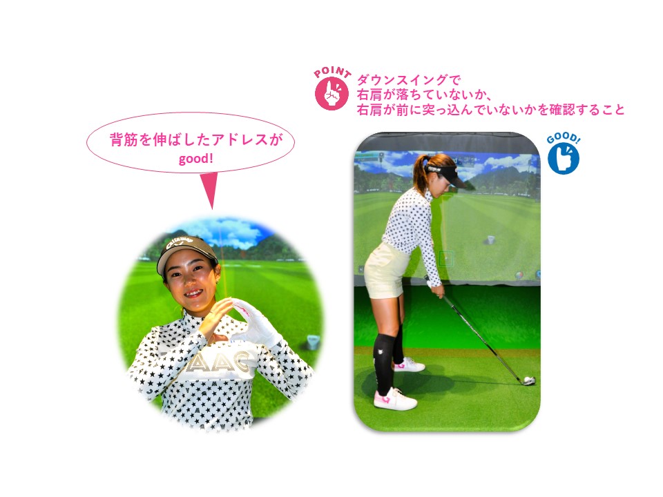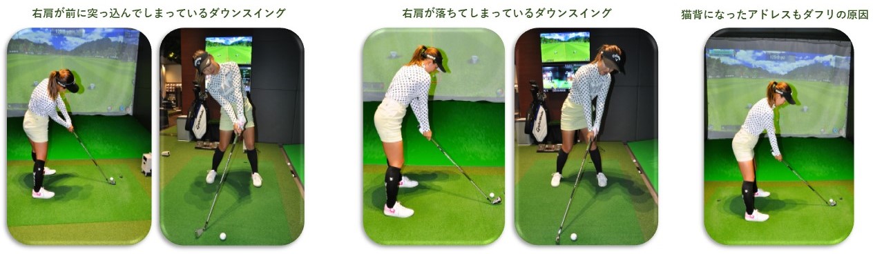特に重要なのがアドレスの形。頭が下がって猫背になっていては、もはやダフリしか出ません。スイング中のチェックポイントとして、ダウンスイングで右肩が落ちていないか︑右肩が前に突っ込んでいないか・・・を確認してください。このような間違った動きを修正するだけでダフリ防止に効果があります。