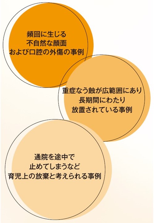 小児歯科領域では、「特徴的な歯科所見をもとに、子ども虐待の徴候をつかもう」という動きが出てきています。具体的には、図6に示すような所見が挙げられています。実際に唐待を受けている子どもが、歯科治療に連れてこられる可能性は低いかと思いますが、もし疑いのあるケースに遭遇した際には適切な対応をお願いいたします。図7にネグレクトによって牛じた多発性う蝕の症例を示します。学校歯科医をされている先生方は、学校函科健診の場でこのような内容が話題になることがあるのではないかと推察しています。ただ、対応に迷うケースも多いかと思いますので、「多発性う蝕に対する専門家への処罹の依頼」という名目で、私たち小児歯科専門医にお任せいただくのも一案だと思います。