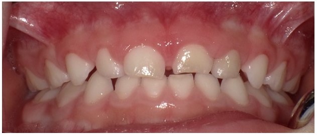 歯周疾患は歯肉炎と歯周炎に分かれますが、子どもで遭遇するのはほとんどが歯肉炎であり(図8)、歯周炎は極めて稀です。つまり、適切な口腔衛生指導を実施し、歯面清掃や歯石除去を行うことで、ほとんどのケ—スで容易に健全な歯周状態に戻すことができます。保護者によっては、家庭で歯石を取り除こうと一生懸命歯磨きをされることがありますので、歯科医院で専門的な器具を用いないと除去できないことを理解してもらってください。