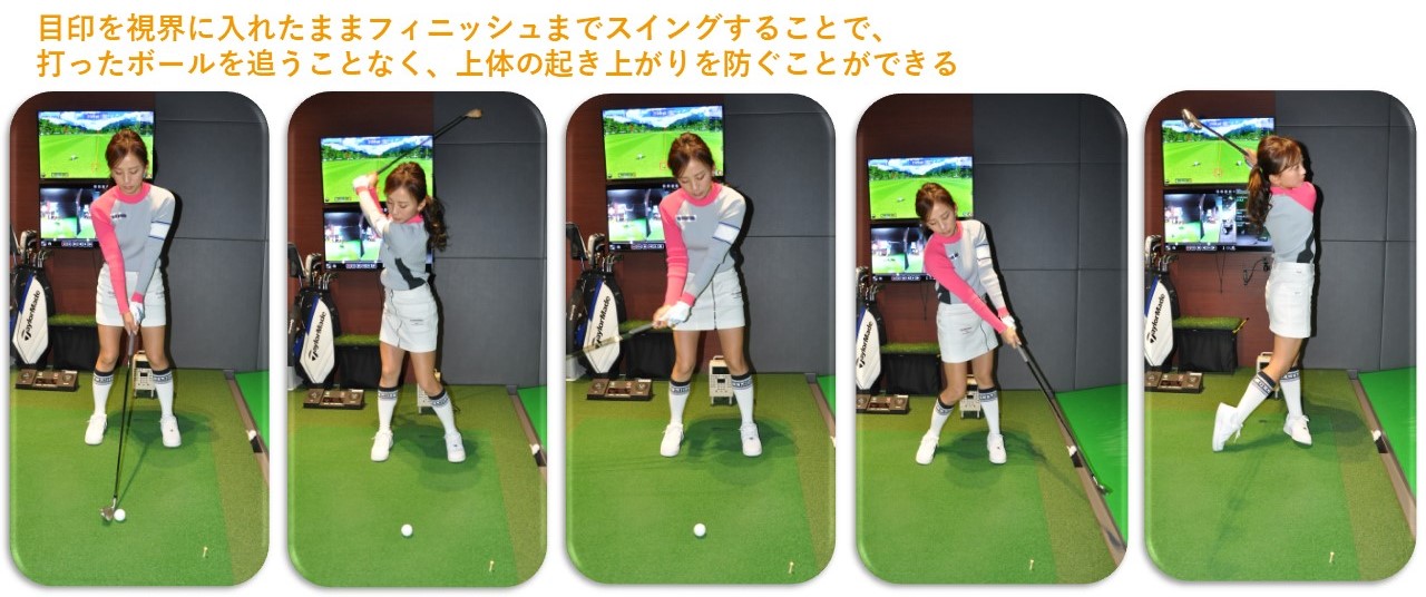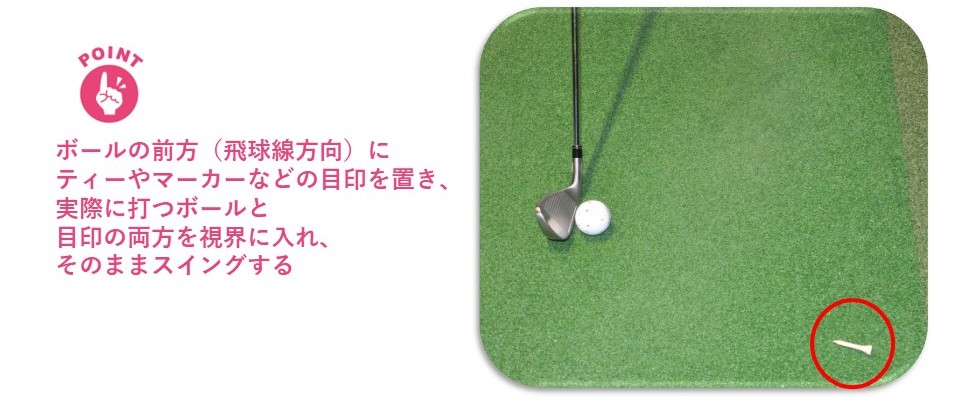 実際に打つボールの前方(飛球線方向)にティーやマーカーなどの目印を置き、アドレスを構えた際に、実際に打つボールと目印の両方を視界に入れ、そのままスイングします。目印を視界に入れたままフィニッシュまでスイングすることで、打ったボールを追うことなく、上体の起き上がりを防ぐことができるわけです。