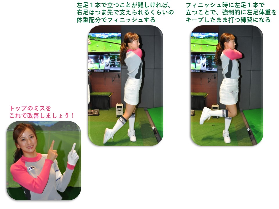 右足体重でのすくい打ちの改善策として有効な練習方法が、フィニッシュの際に左足1本で立つというものです。完全に右足を浮かさなくとも、右足はつま先で支えられるくらいの体重配分です。フィニッシュ時に左足1本で立つことによって、右足に体重を乗せようと思ってもできず、強制的に左足体重をキープしたまま打つ練習になります。